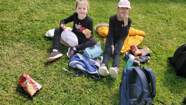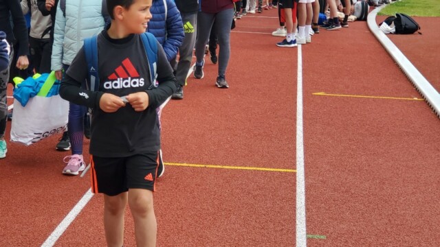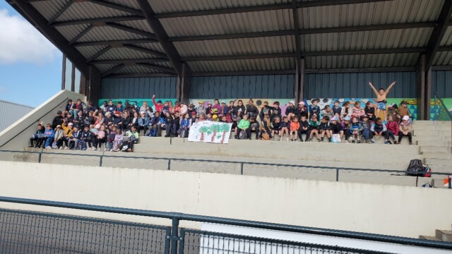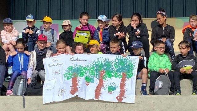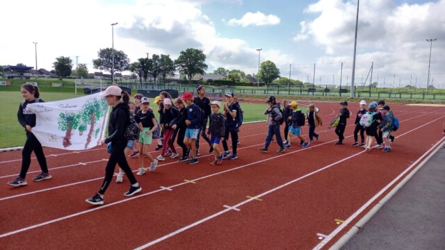 Les enfants ont commencé la journée par un tour de piste derrière leur drapeau (réalisé par les enfants). Le drapeau de l’école Ste Marie représentait notre environnement : les arbres de notre bel espace cour (5 arbres pour nos 5 classes avec des mains en guise de feuilles pour symboliser les enfants).
