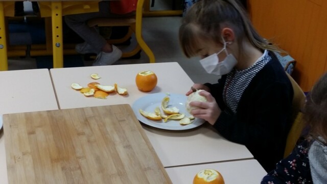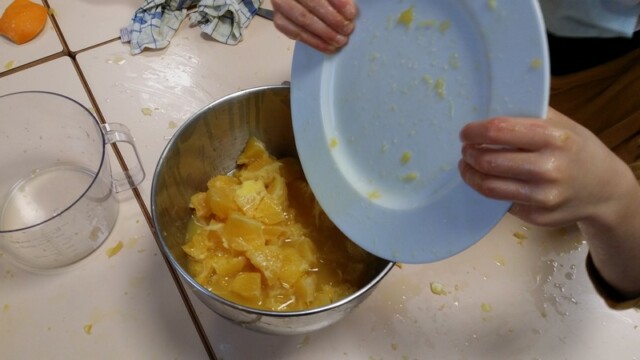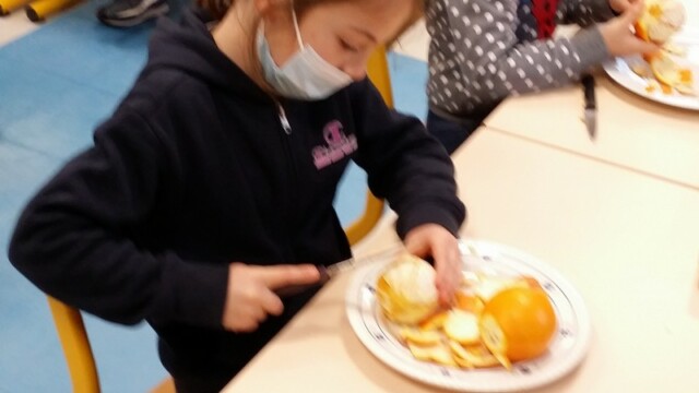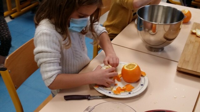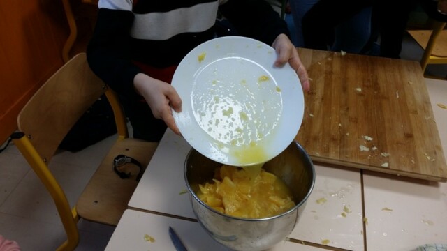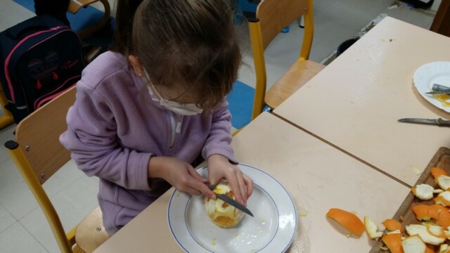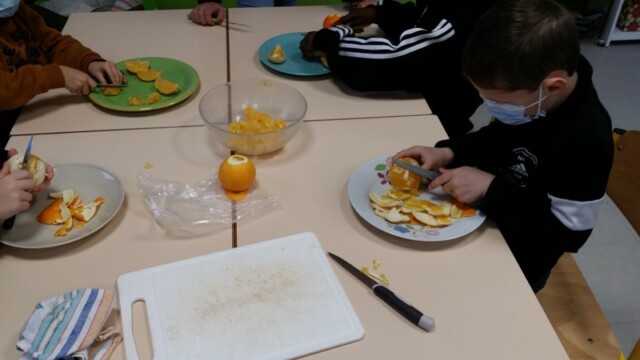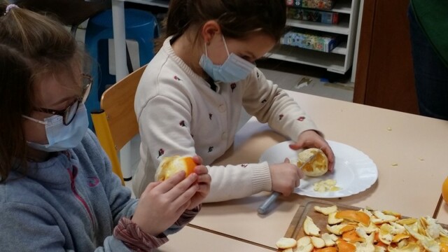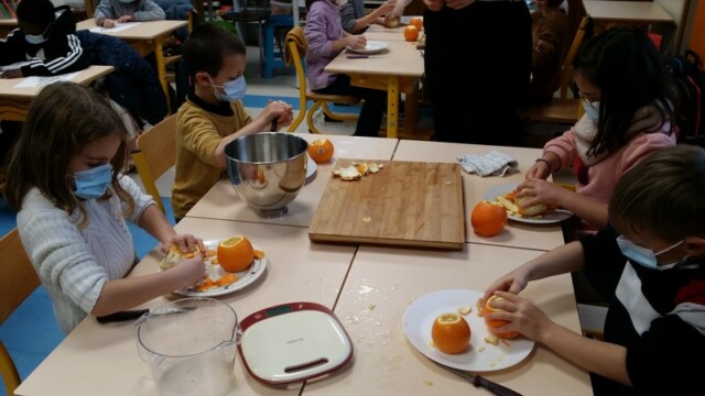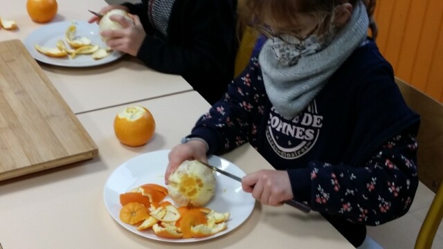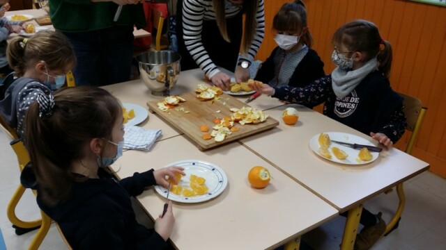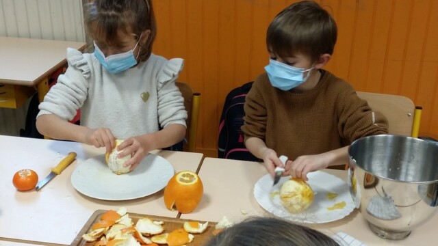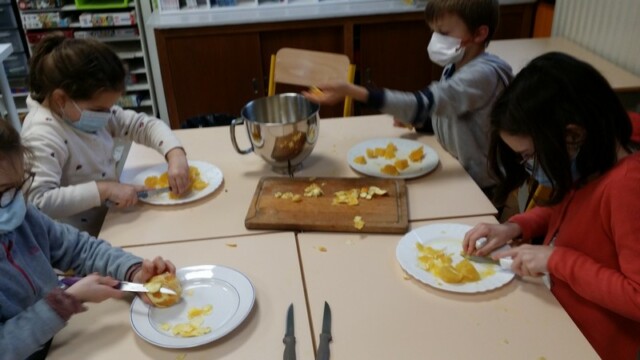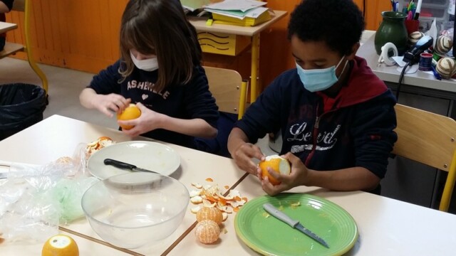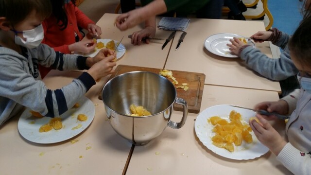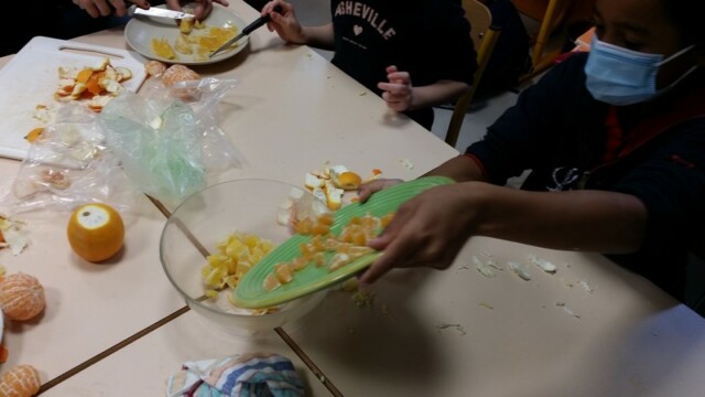 Tout d’abord, ils ont apporté des oranges qu’il a fallu éplucher puis couper pour en faire une “Confiture de Noël”.