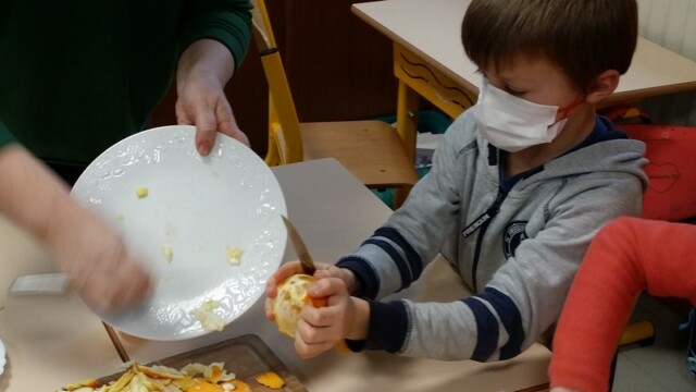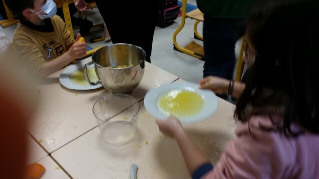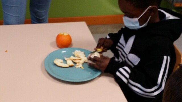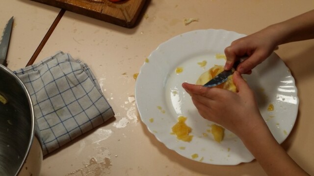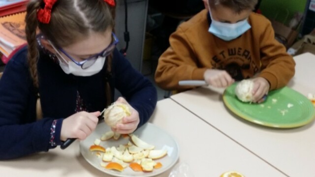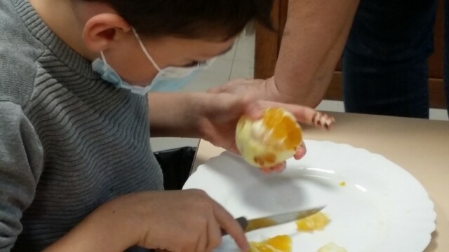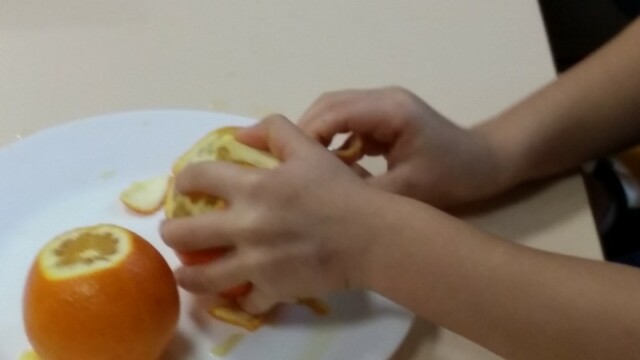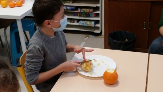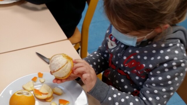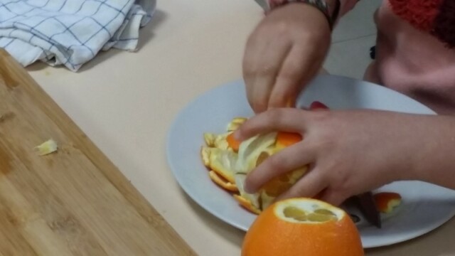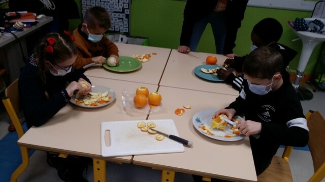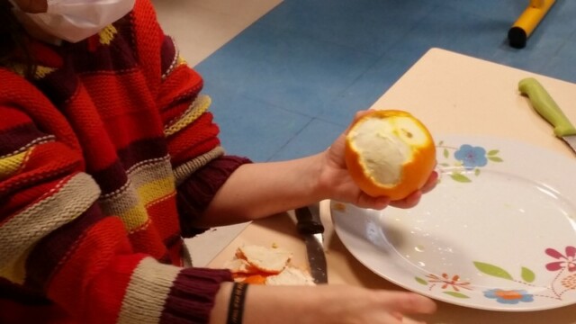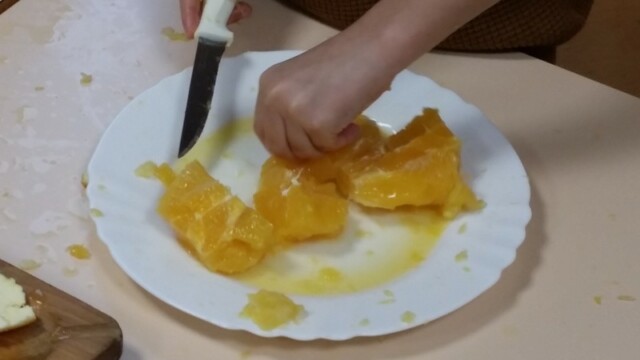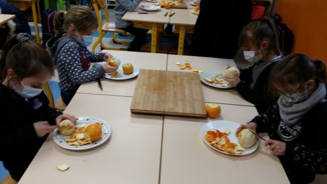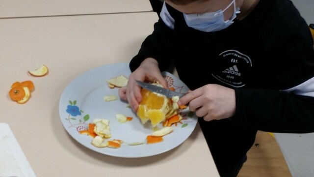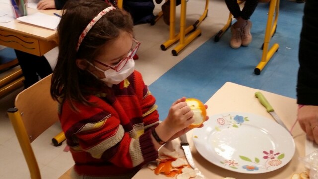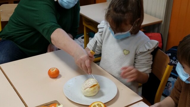 Tout d’abord, ils ont apporté des oranges qu’il a fallu éplucher puis couper pour en faire une “Confiture de Noël”.