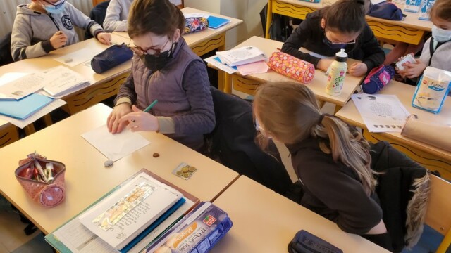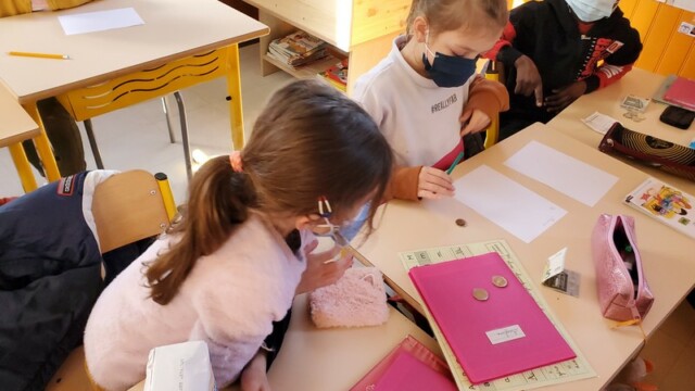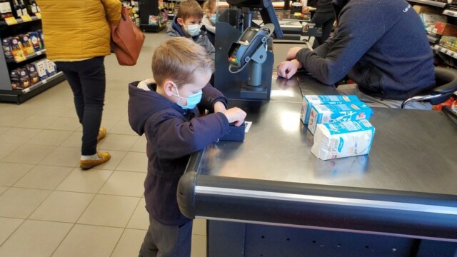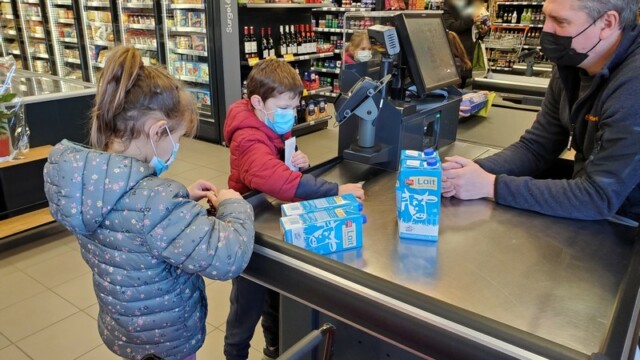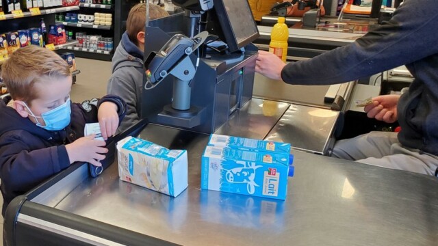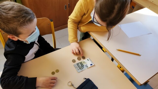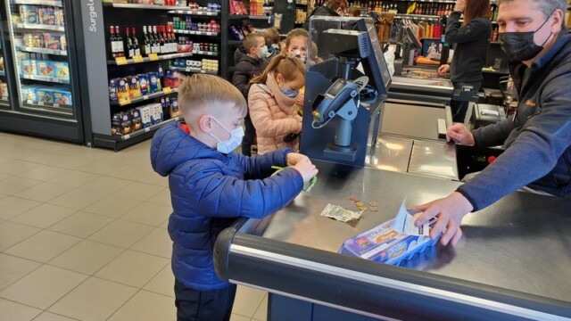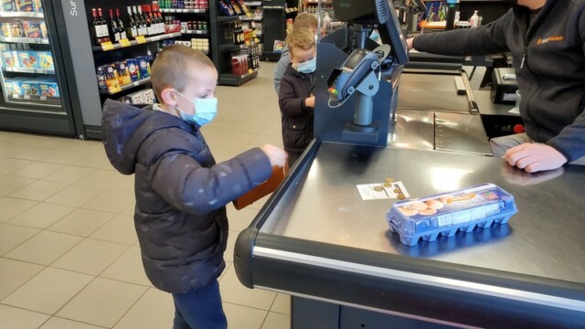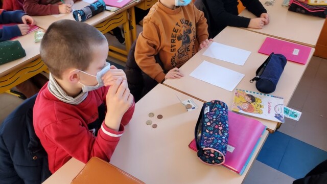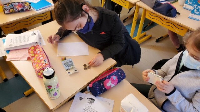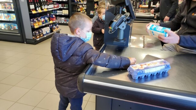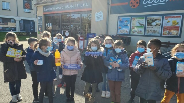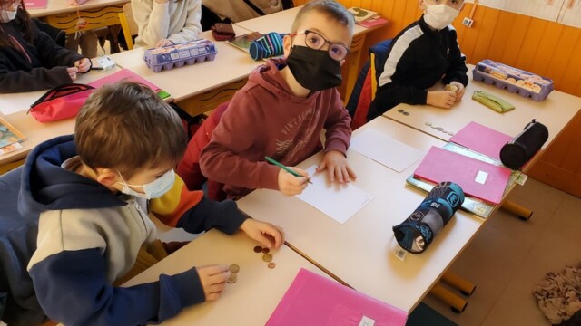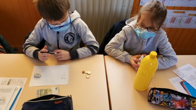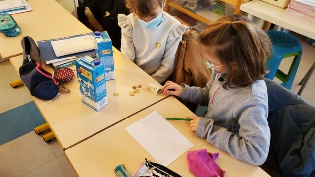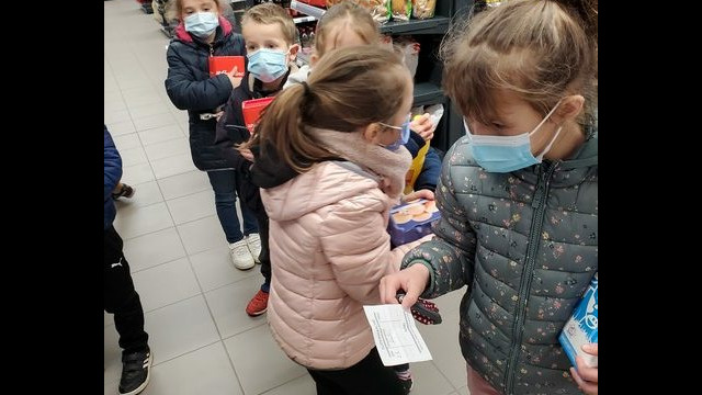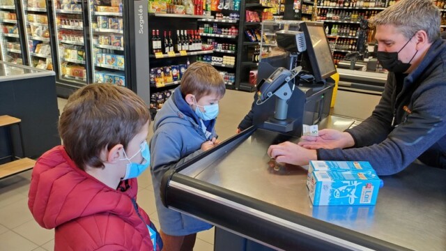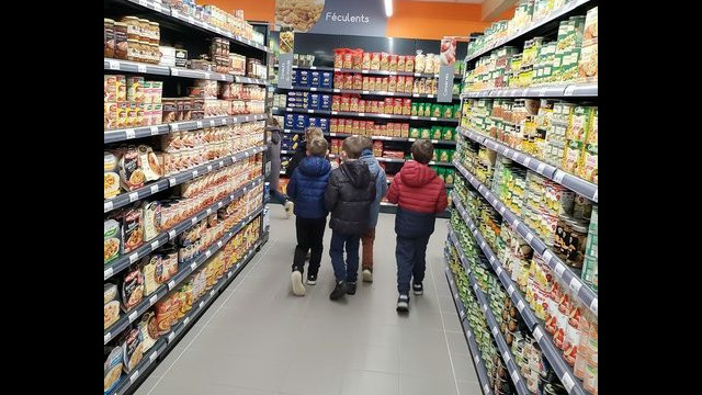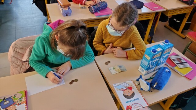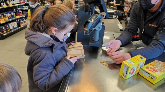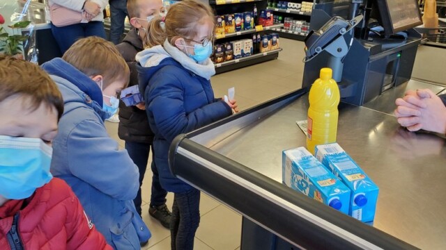 Ce matin, les enfants de CP sont allés faire les courses au magasin Coccimarket. Leur mission était d’acheter tous les ingrédients nécessaires à la fabrication des crêpes pour toute l’école. Chacun est parti avec 10€ dans son porte-monnaie et à payer lui-même son achat. Au retour, les CE1 ont calculé la dépense de chacun et notre dépense totale. Rien de tel qu’une situation concrète pour bien comprendre la monnaie. Galerie introuvable !