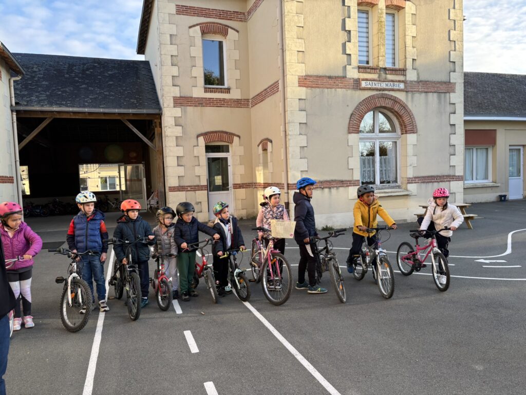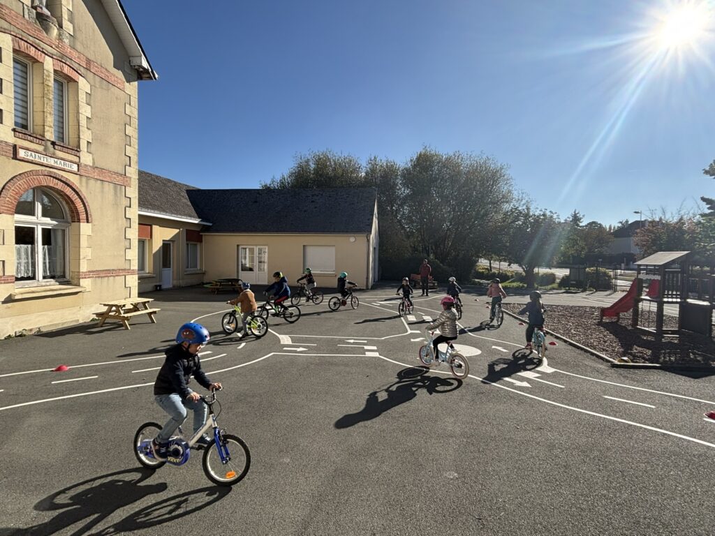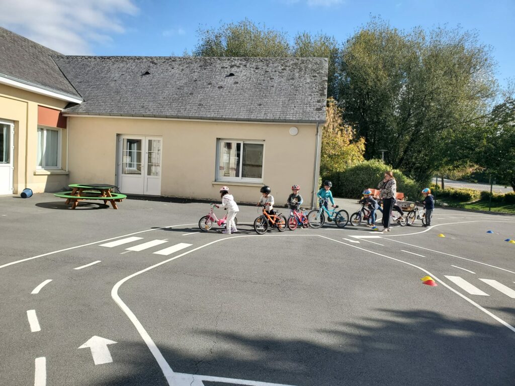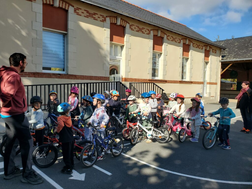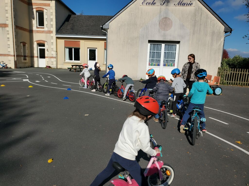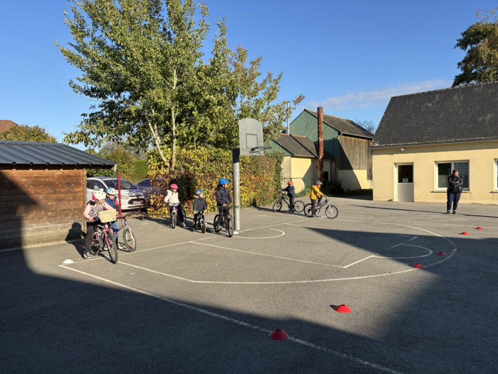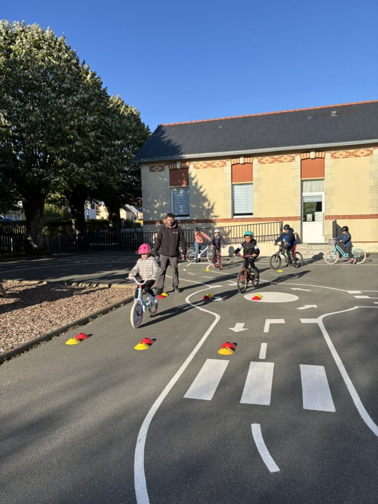 Une initiation vélo a été proposée aux élèves ! Marion et Jean-Sébastien ont d’abord rappelé les règles de sécurité et détaillé les différents éléments d’un vélo. Ensuite, différents ateliers ont permis d’apprendre à s’arrêter dans une zone bien définie ou au niveau d’un plot, à lâcher une main et à faire des slaloms avec des virages parfois un peu serrés ! Nous avons prolongé l’expérience le lendemain.