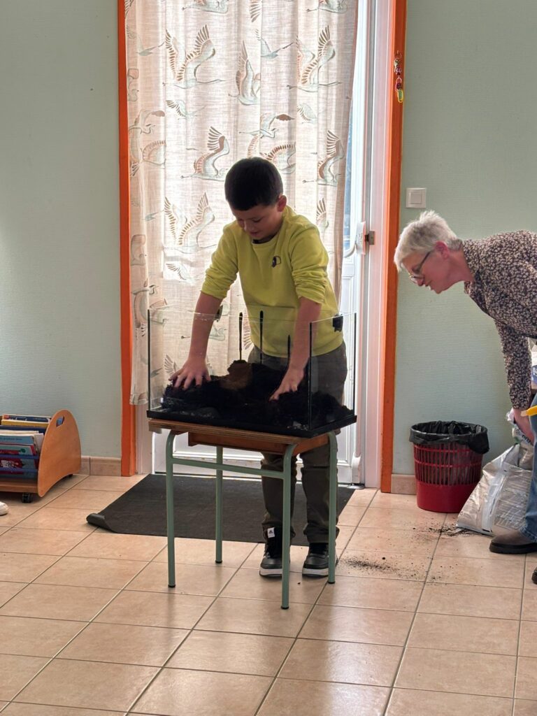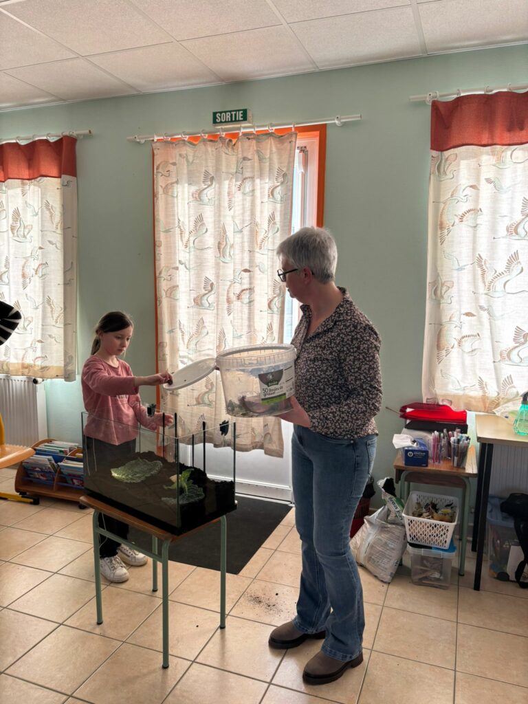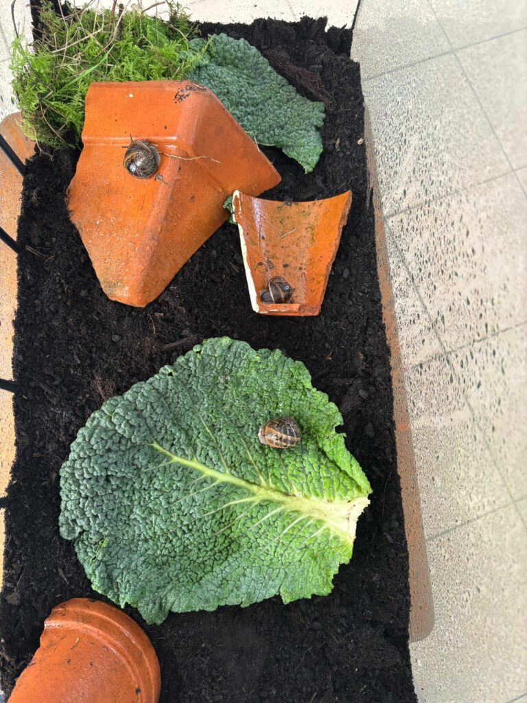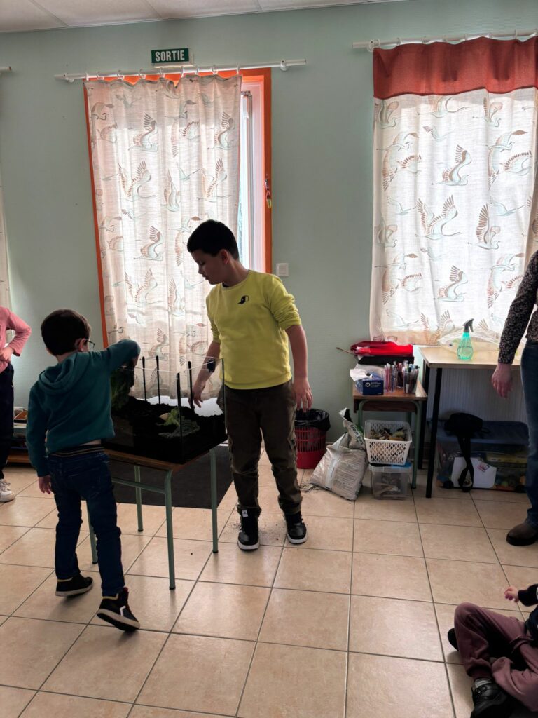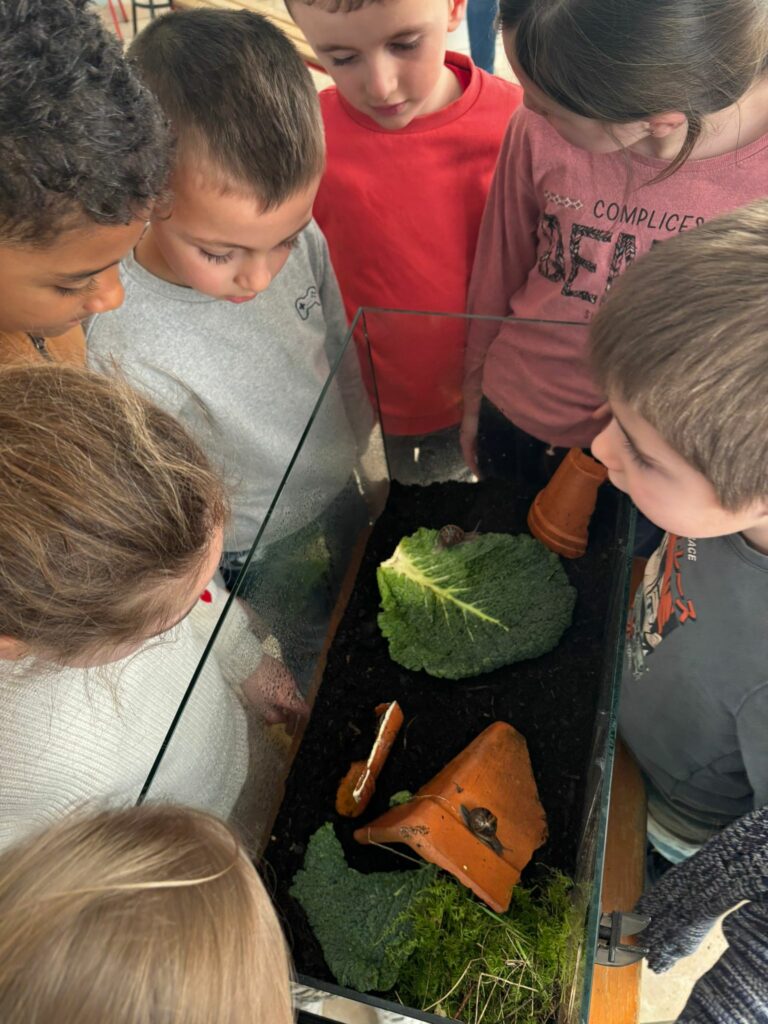En attendant, nous avons mis en place une escargotière. Nous avons pour l’instant 3 locataires… mais les enfants vont partir à la recherche de nouveaux copains pour nos escargots.