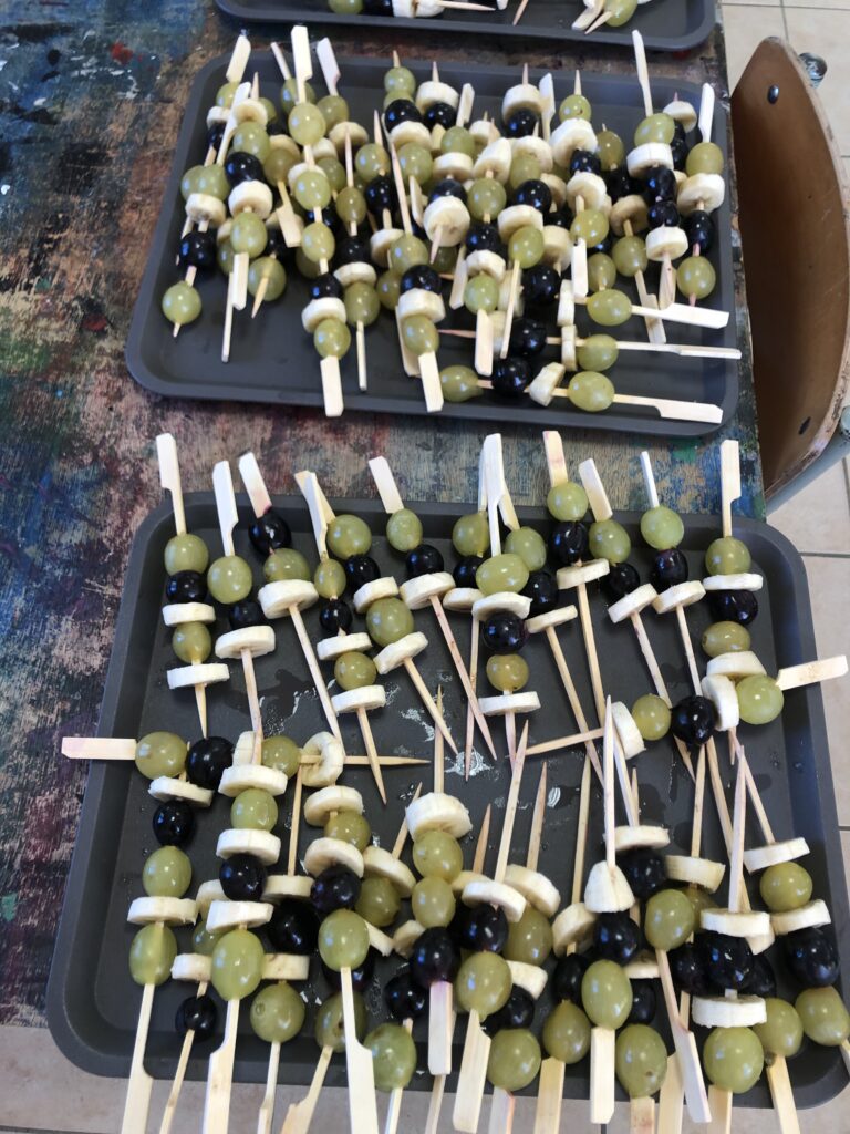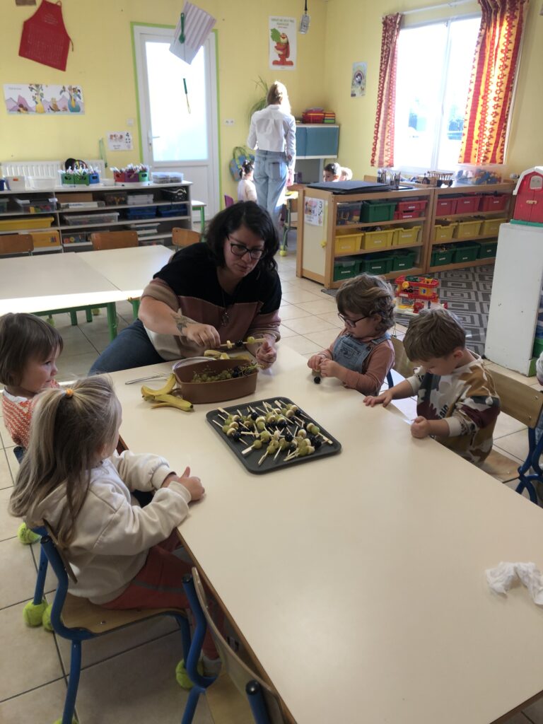 Vendredi 17 octobre, nous avons préparé des brochettes de fruits ( raisin noir , raisin blanc et banane) pour les autres classes.